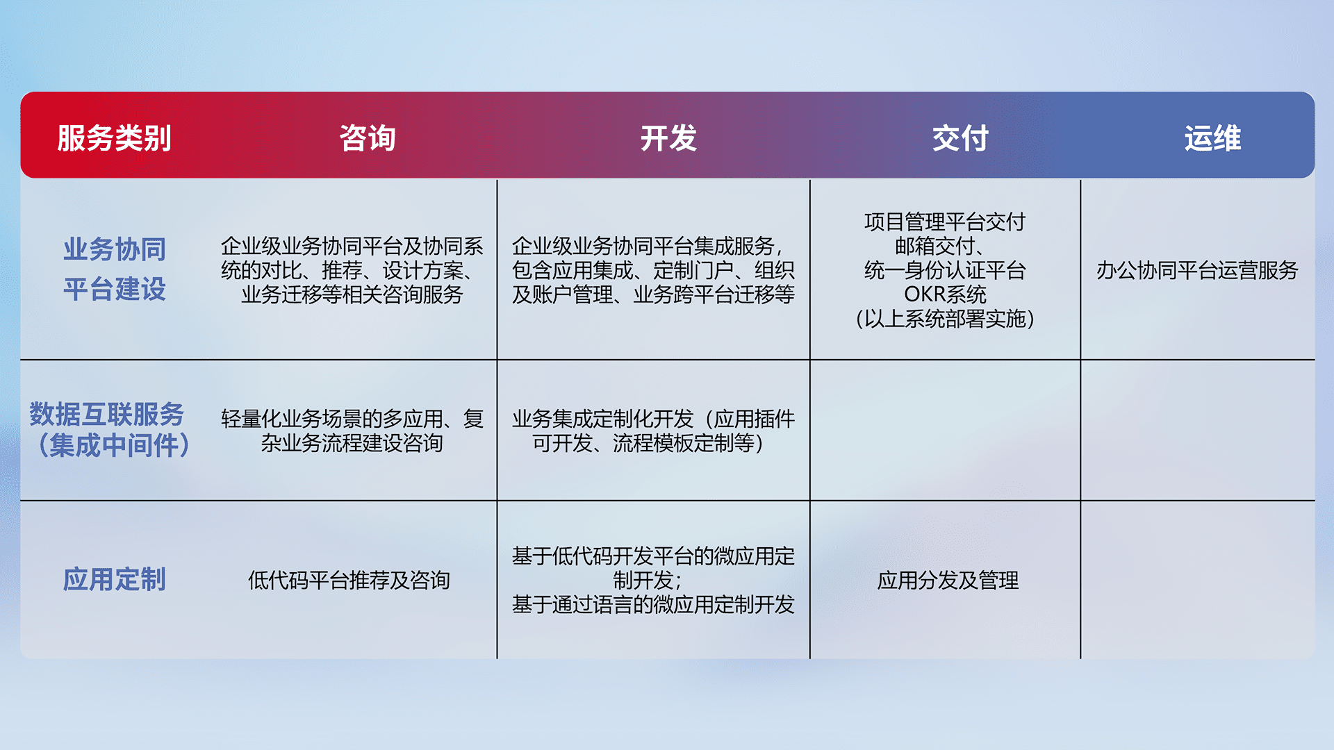 针对钉钉、、、、企微、、IDaas等平台级产品提供产品的规划、、方案、、交付、、、定制化开发等服务,,实现如统一协同办公、、、、智能客户服务、、混合会议管理、、、、智能数据查询、、等业务场景,,,实现数字化转型。。。